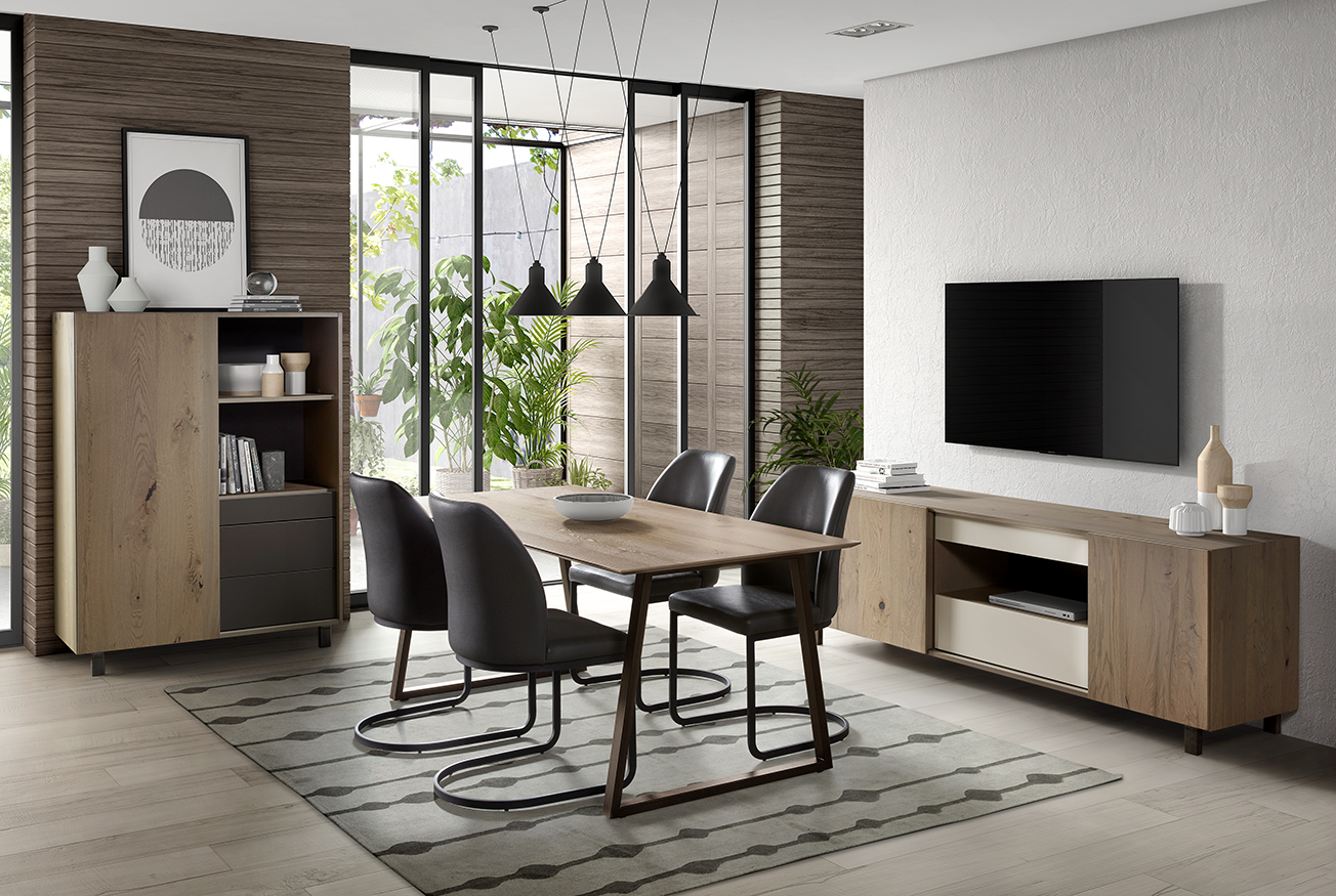 Eetkamertafel met robuust metaalkleurig trapezium onderstel en een verjongd blad dat naar keuze in 3 verschillende crack eiken kleuren leverbaar is.